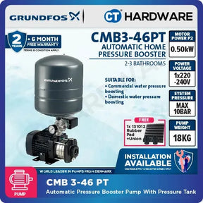 Experience consistent and optimal water pressure throughout your home with the Grundfos CMB3-46PT Automatic Home Pressure Booster Pump. This efficient and reliable pump comes equipped with an 18-liter pressure tank, ensuring a steady supply of water and reducing pump cycling for extended pump life. Powered by a 0.5kW motor, it delivers a maximum flow rate of 68 liters per minute and a head of up to 46 meters, making it ideal for single and multi-story homes.