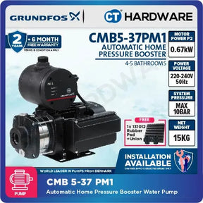 Experience superior water pressure throughout your home with the Grundfos CMB5-37PM1 Automatic Home Pressure Booster Pump. Designed for residential applications, this high-performance pump ensures a reliable and efficient water supply for all your household needs. Powered by a 0.67kW motor, it delivers a maximum flow rate of 100 liters per minute and a head of up to 38 meters, making it ideal for medium to large homes.