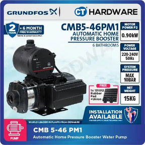 Experience superior water pressure throughout your home with the Grundfos CMB5-46PM1 Automatic Home Pressure Booster Pump. Designed for residential applications, this high-performance pump ensures a reliable and efficient water supply for all your household needs. Powered by a 0.9kW motor, it delivers a maximum flow rate of 101 liters per minute and a head of up to 47.7 meters, making it ideal for medium to large homes.