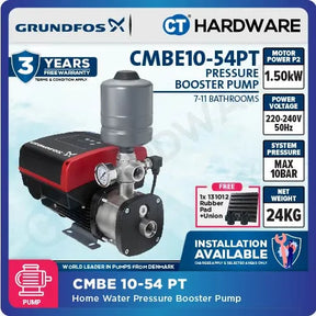 Experience unparalleled water pressure and intelligent control with the Grundfos CMBE10-54 Home Water Pressure Booster Pump. Designed for large households and light commercial applications, this advanced pump comes equipped with a 2-liter pressure tank and variable speed drive (VSD) technology. Powered by a robust 1.5kW motor, it delivers a maximum flow rate of 266 liters per minute and a head of up to 56 meters, ensuring a strong and consistent water supply even during peak usage periods.