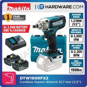 Makita DTW190RFX2 Cordless Impact Wrench 18V 1/2" DR. 190Nm with 2x 3.0Ah Batteries