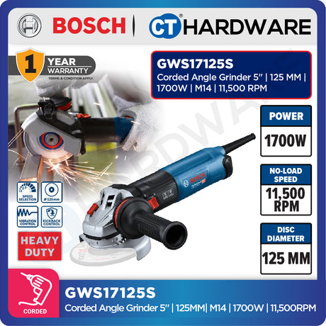 From RM1,050.00Unit price /UnavailableVery low stockBosch GWS17125S Corded Angle Grinder 5" | 125MM | 1200W | M14 | 11,500 RPM