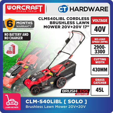 RM419.00Unit price /UnavailableVery low stockWORCRAFT CLM-S40LiBL-SOLO Cordless Brushless Lawn Mower 20V+20V 17" 3300RPM [CLMS40LIBLSOLO]