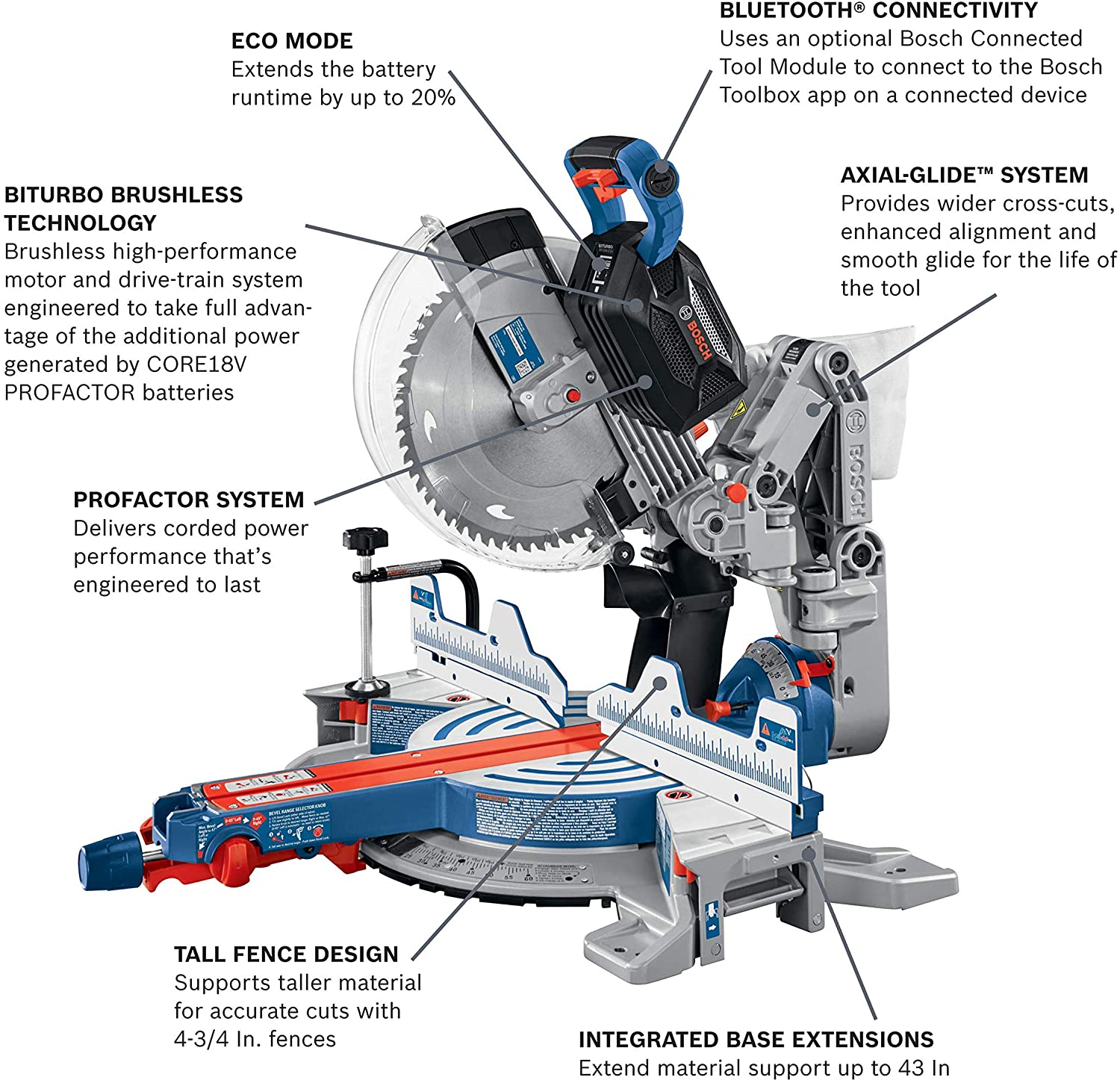 - Brushless motor powered by ProCORE18V battery delivers cordless power equal to 2000W corded mitre saw