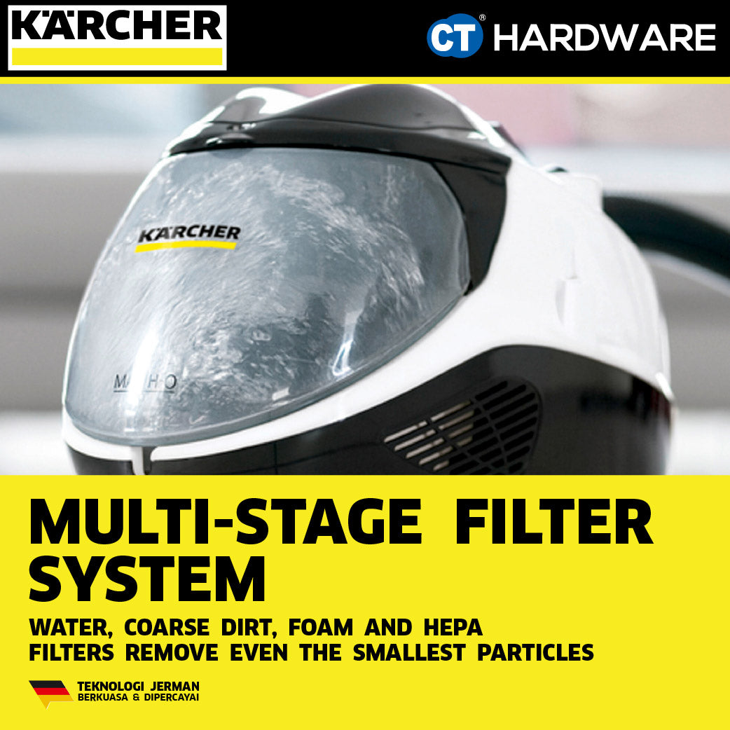Water, coarse dirt, foam and HEPA filters (EN 1822:1998) remove even the smallest particles.