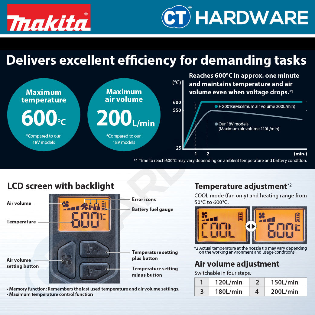 - Equipped with a backlit LCD, the tool enables precise adjustment of temperature and airflow.