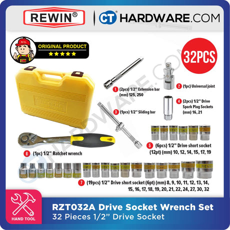 Sale price RM186.10 Regular price RM214.50Unit priceLow stockREWIN RZT032A 32PCS 1/2" DR. SOCKET WRENCH SET 1/2" 8-32MM 6PT / 12PT