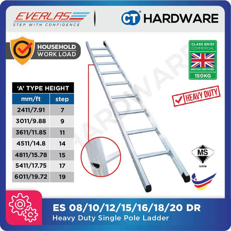 From RM142.00Unit price /UnavailableLow stockEverlas ES-DR Series Heavy Duty Single Pole Ladder 7 Rungs - 20 Rungs | 150kg Max Load | SIRIM