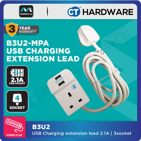 RM129.00Unit price /UnavailableMasterplug B3U2 3-Socket 13A Extension Lead | 2 USB 2.1A (2m)