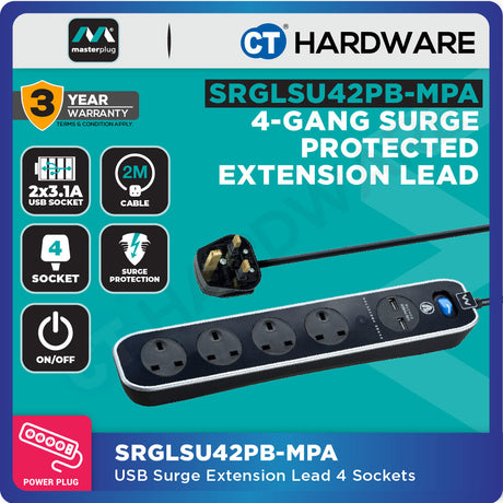 RM99.00Unit price /UnavailableLow stockMasterplug SRGLSU42PB-MPA 4-Gang Surge Protected Extension Lead | 2 USB 3.1A (2m)