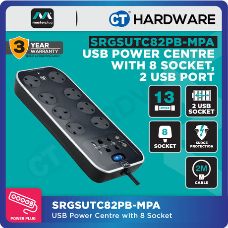 RM145.00Unit price /UnavailableVery low stockMasterplug SRGSUTC82PB-MPA Surge Protected Power Strip 8-Gang | 2 USB
