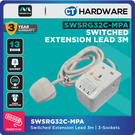 RM59.00Unit price /UnavailableVery low stockMasterplug SWSRG32C Switched Extension Lead 3m | 3-Sockets | 13A