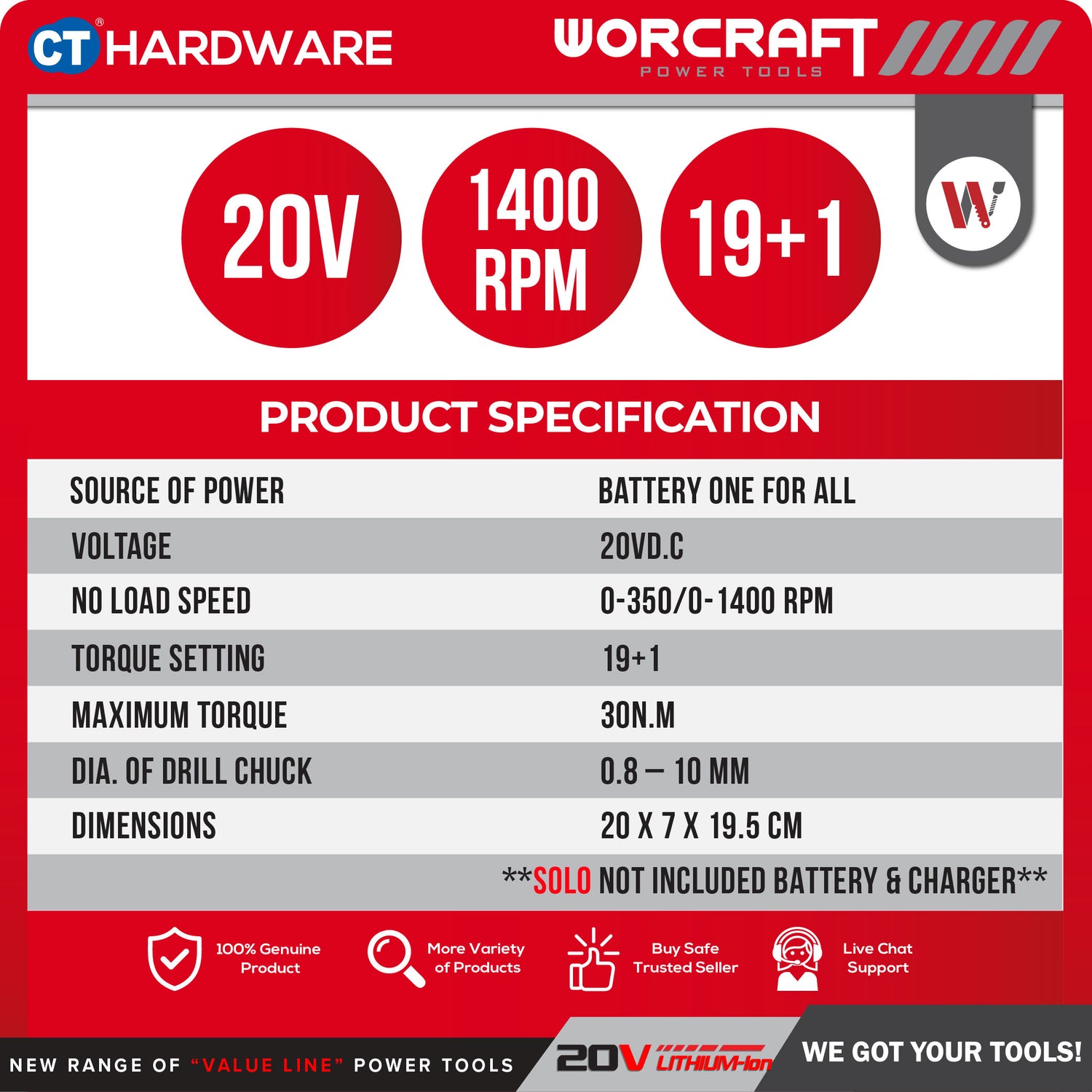 WORCRAFT CD-S20LIE CORDLESS DRILL 20V [ CDS20LIE ] [Set Pack with 2.0AH Battery]