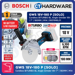 Bosch GWS 18V-180 P SOLO Cordless BITURBO BL Angle Grinder 18V 7"+1x Diamond Disc & 2x EXPERT INOX Cutting Disc [GWS18V180PSOLO]