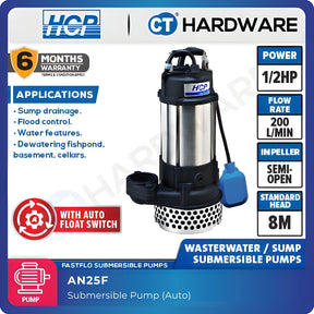 HCP AN25F SUBMERSIBLE WASTEWATER SUMP PUMP 2" | 1/2HP | MAX 200L/MIN| AUTO [ A05BF ]