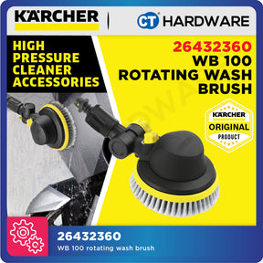 Rotating wash brush with joint ideal for cleaning all smooth surfaces, e.g. paint, glass or plastic. Wash brush with a host of practical features: rotating bristles with gentle cleaning action, 180° infinitely adjustable joint on handle for cleaning difficult to reach areas , infinitely adjustable speed and detergent dosing, easy to change brush attachment, outer protector ring for protection against scratches and union nut for secure gun connection. In brief: the ideal solution for smooth surfaces. The rotating wash brush is suitable for all Kärcher K 2 to K 7 pressure washers.