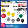 High-quality replacement nozzles for fast and simple nozzle changing. Contents: three pairs of nozzles for various pressure washer performance classes, one power nozzle for cleaning corners and edges in combination with the T 400, T 450 and T 550 surface cleaners, as well as two brackets for securing them in place. The replacement nozzles are suitable for the following accessories: T-Racer surface cleaners for the ranges K 2 to K 7 (excl. T 350), PC 20 gutter cleaner for the ranges K 3 to K 7, as well as chassis cleaner for the ranges K 2 to K 5.