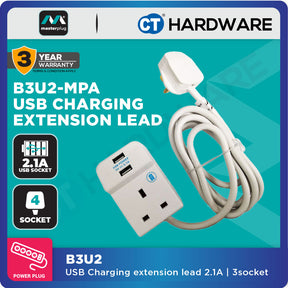 Masterplug B3U2 3-Socket 13A Extension Lead | 2 USB 2.1A (2m)