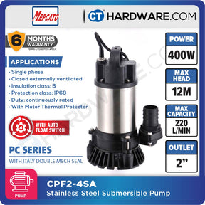 MEPCATO CPF2.4SA STAINLESS STEEL SUBMERSIBLE PUMP 400W 220L/MIN 2"' | 12M/H | 1PH | AUTO ( SITE DRAINAGE PUMP )WITH ITALY MECH SEAL [ CPF24SA ]