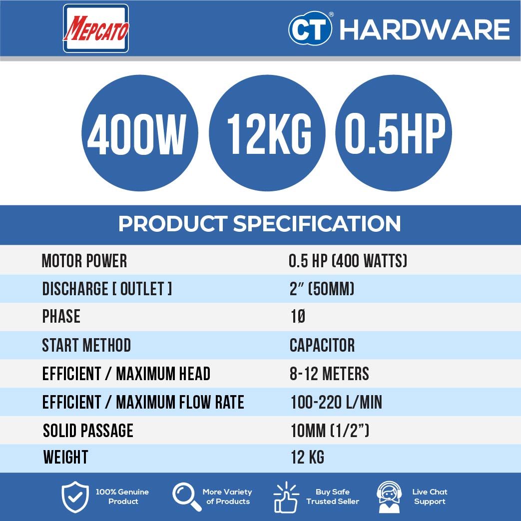 ![MEPCATO CPF2.4SA STAINLESS STEEL SUBMERSIBLE PUMP 400W 220L/MIN 2"' | 12M/H | 1PH | AUTO ( SITE DRAINAGE PUMP )WITH ITALY MECH SEAL [ CPF24SA ]](http://cthardware.com/cdn/shop/files/cpf24sa-25.jpg?v=1743058160&width=1214)