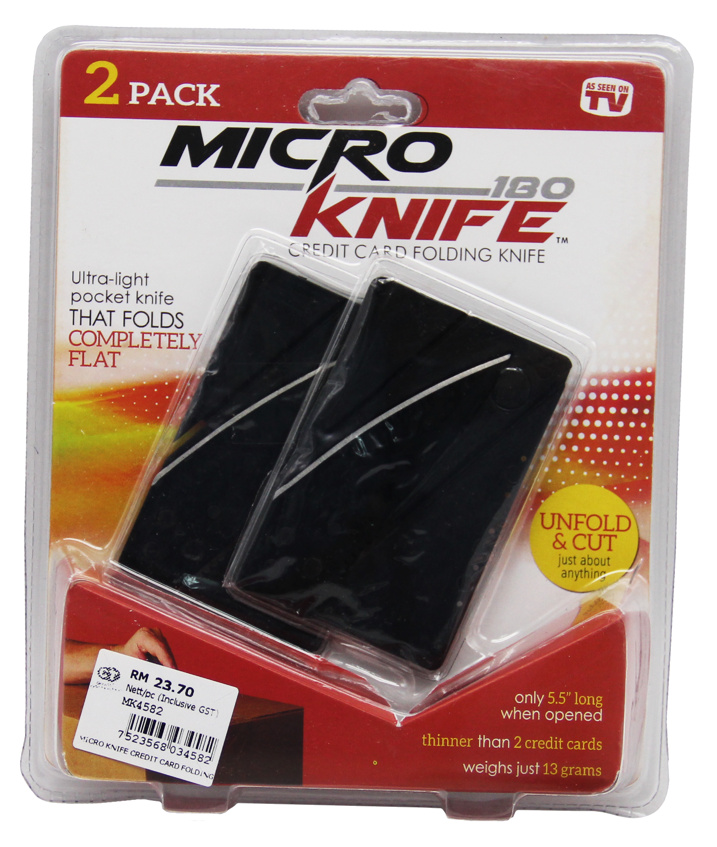 Thinner than two credit cards, the 13-gram MicroKnife 180 transforms from a credit card-shaped sheet into a well-balanced knife with a 2.5-inch blade when opened - equally suited to opening envelopes, packages, cutting ropes, boxes and anywhere a knife is needed.
