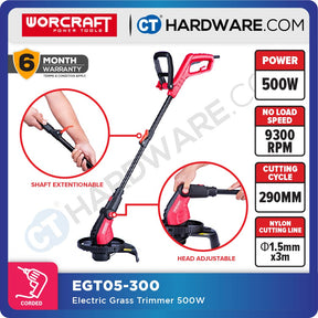 This WORCRAFT EGT05-300 Line Trimmer is ideal for trimming lawn edges and grass around trees and shrubs. A rotating head with a unique edging wheel provides greater control when operating in edger mode. The telescopic shaft can be adjusted to suit the height of the operator for improved ergonomics. The Auxiliary handle can be tilted to the desired angle as you wish for comfortable handling. An adjustable cutting head allows easy trimming under low-hanging shrubs and trees. The automatic line feed is fast, convenient, and increases ease of use.
